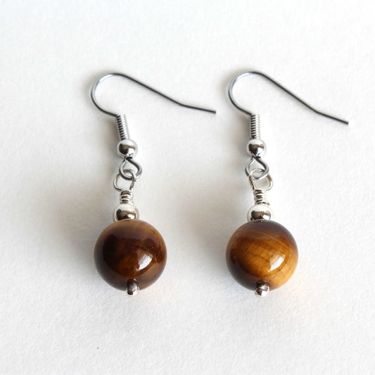 Sterling Silver Tiger's Eye Dangle Earrings - 3 Bead Natural Stone