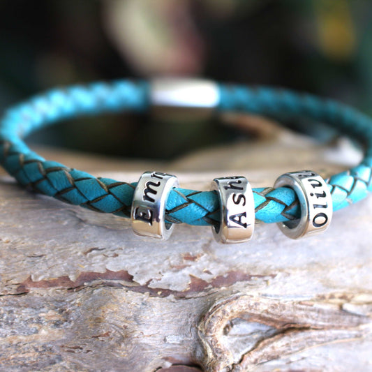 Turquoise Braided Leather Bracelet with Personalized Sterling Silver Name Beads