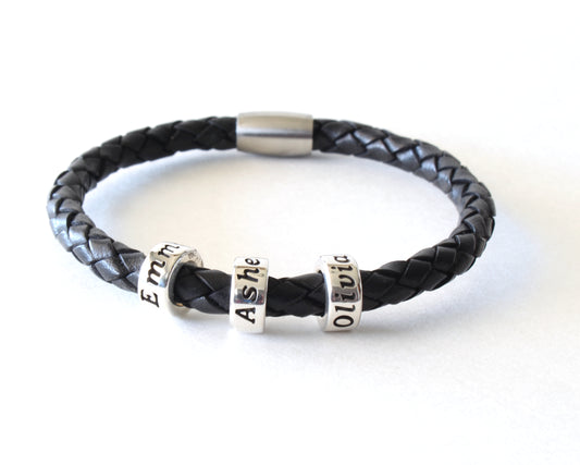 Black Braided Leather Bracelet with Personalized Sterling Silver Name Beads