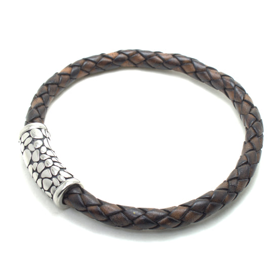 Antique Brown Braided Leather Bracelet with Textured Metal Clasp – Handcrafted Boho Chic Jewelry