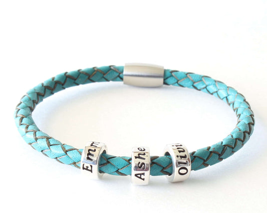 Turquoise Braided Leather Bracelet with Personalized Sterling Silver Name Beads
