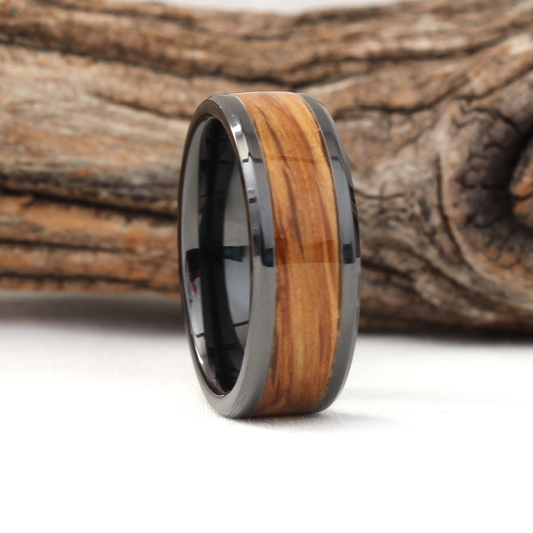 Black Ceramic Ring with Whiskey Barrel Wood Inlay