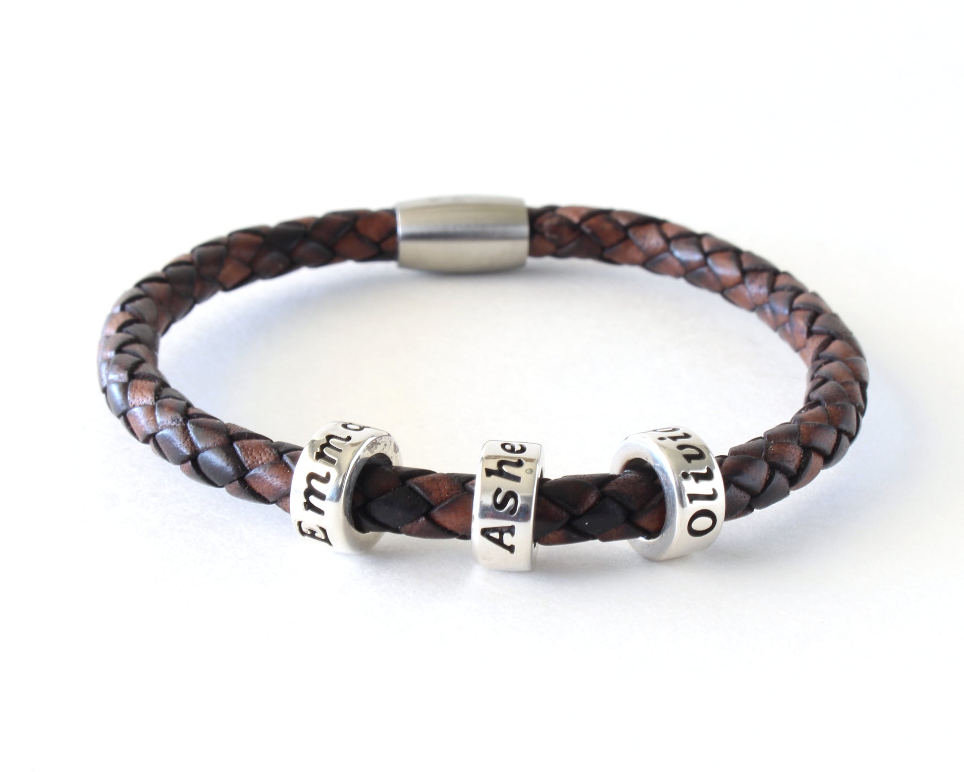 This handcrafted antique brown braided leather bracelet features sleek sterling silver beads, each custom-engraved with the names of your loved ones. The rich, dark leather band adds a rugged yet refined touch, while the polished silver rings stand out beautifully — making it the perfect everyday accessory for both men and women.