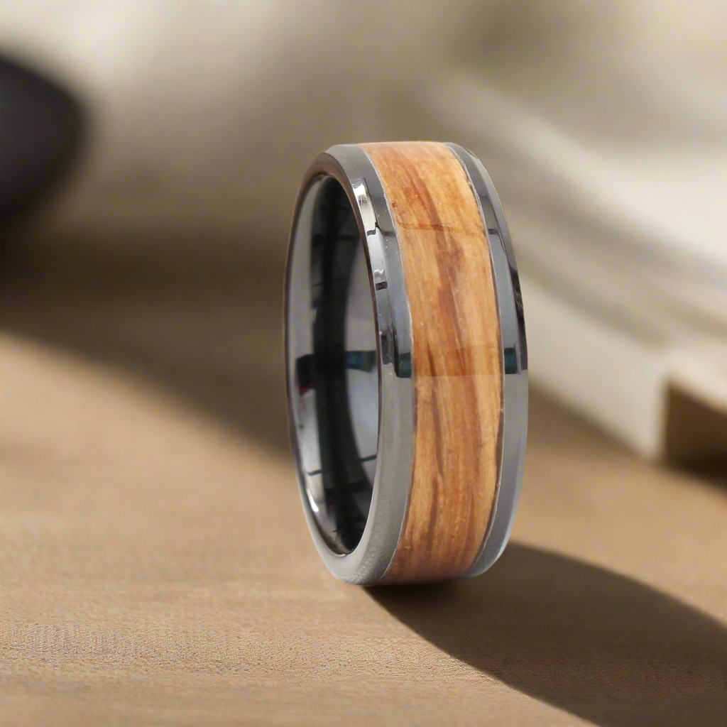 Add a touch of unique style with our Black Ceramic Ring featuring a unique inlay of whiskey barrel wood, cut to show its natural face grain. Crafted with a durable black ceramic base, this ring is perfect for any man looking for a statement piece.