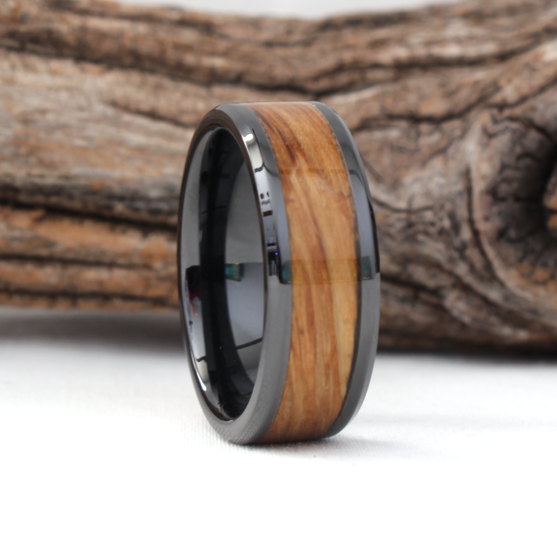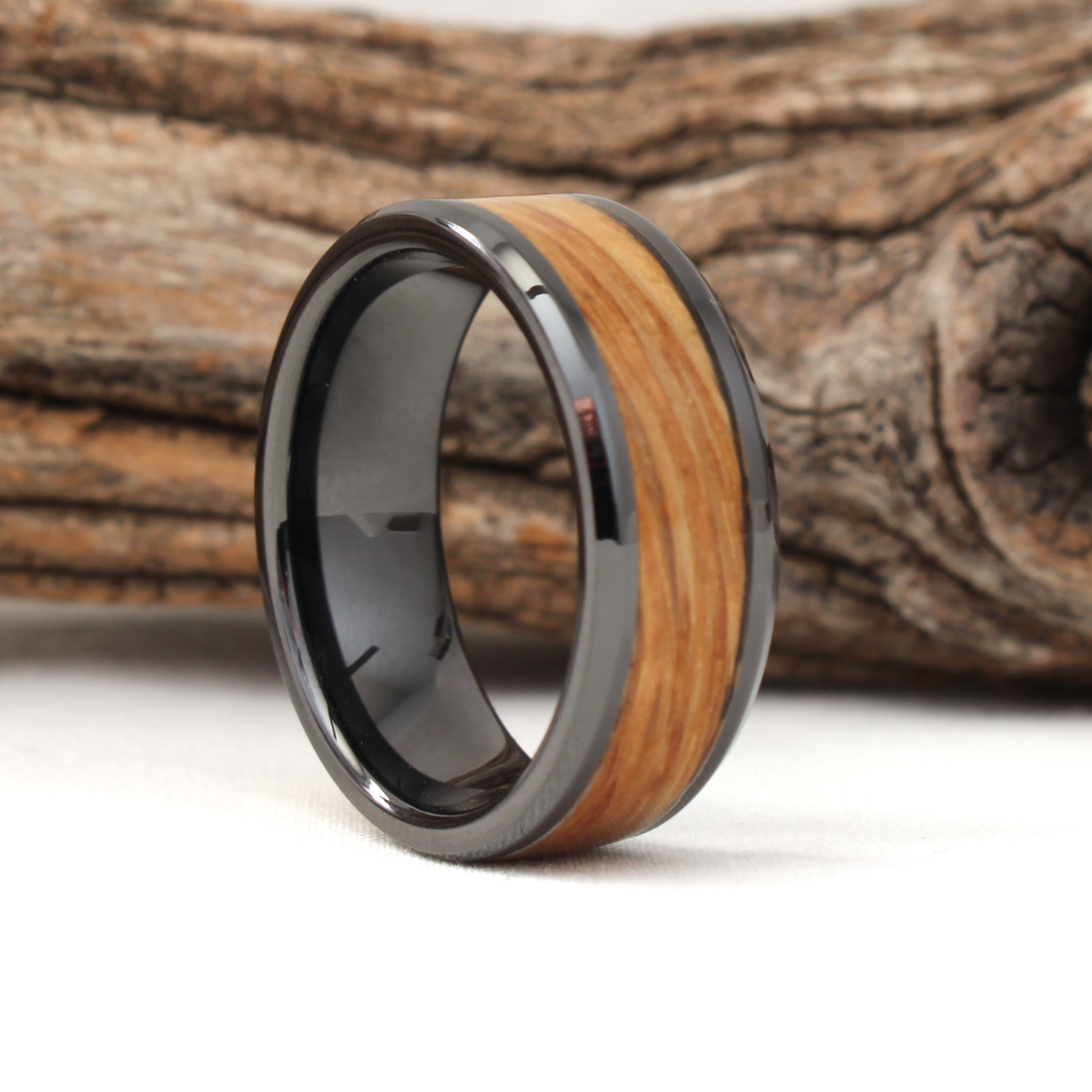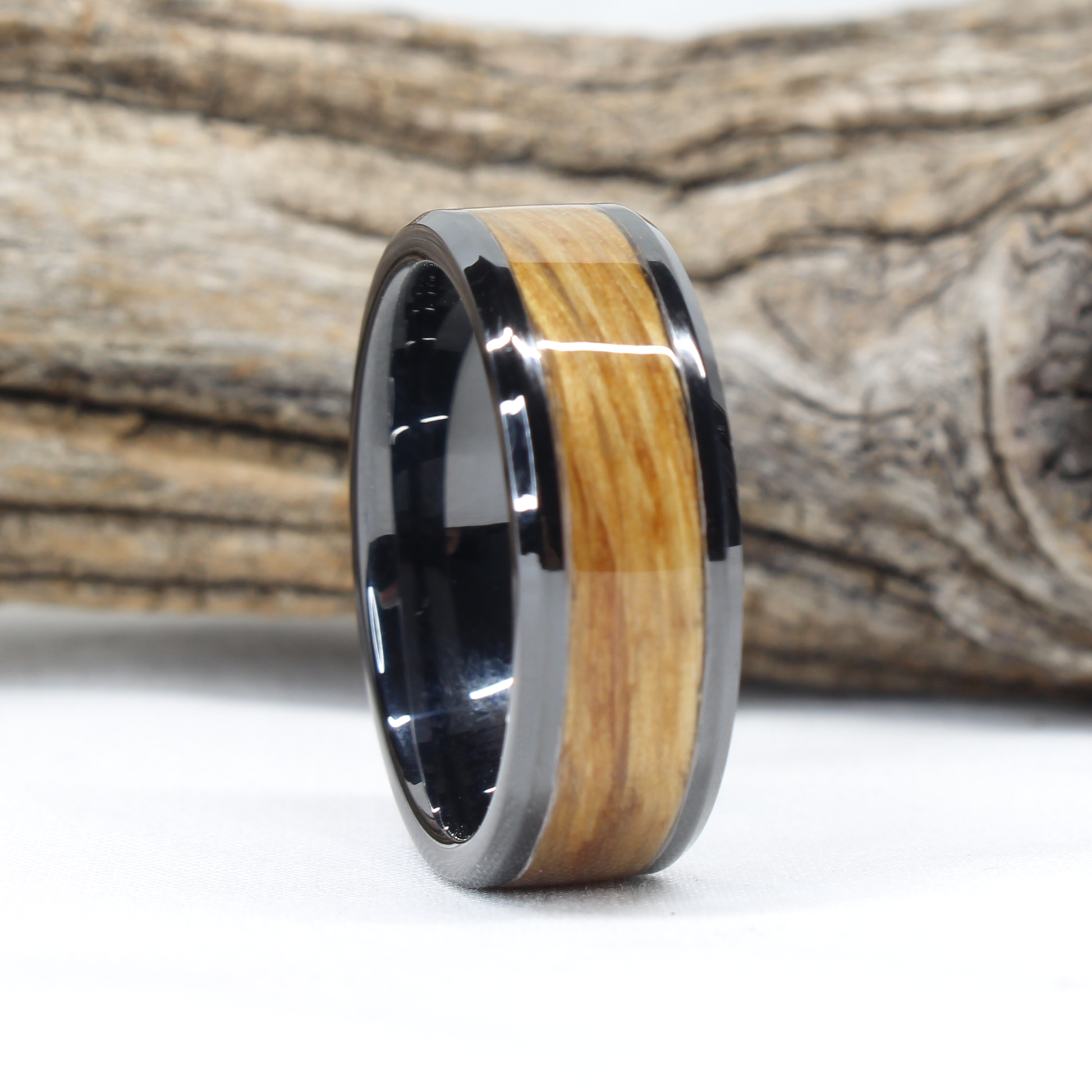 Black Ceramic Ring with Whiskey Barrel Wood Inlay Face Grain