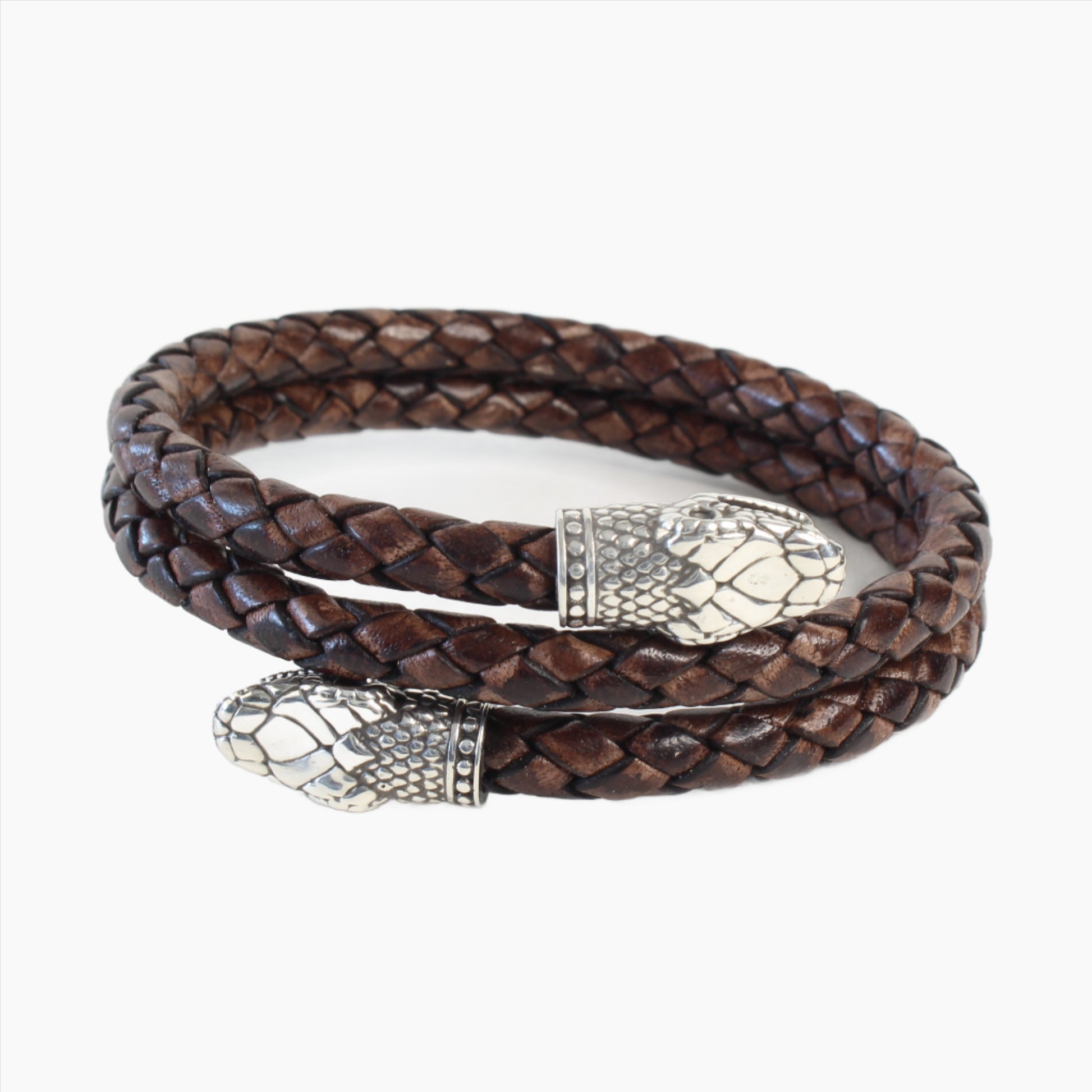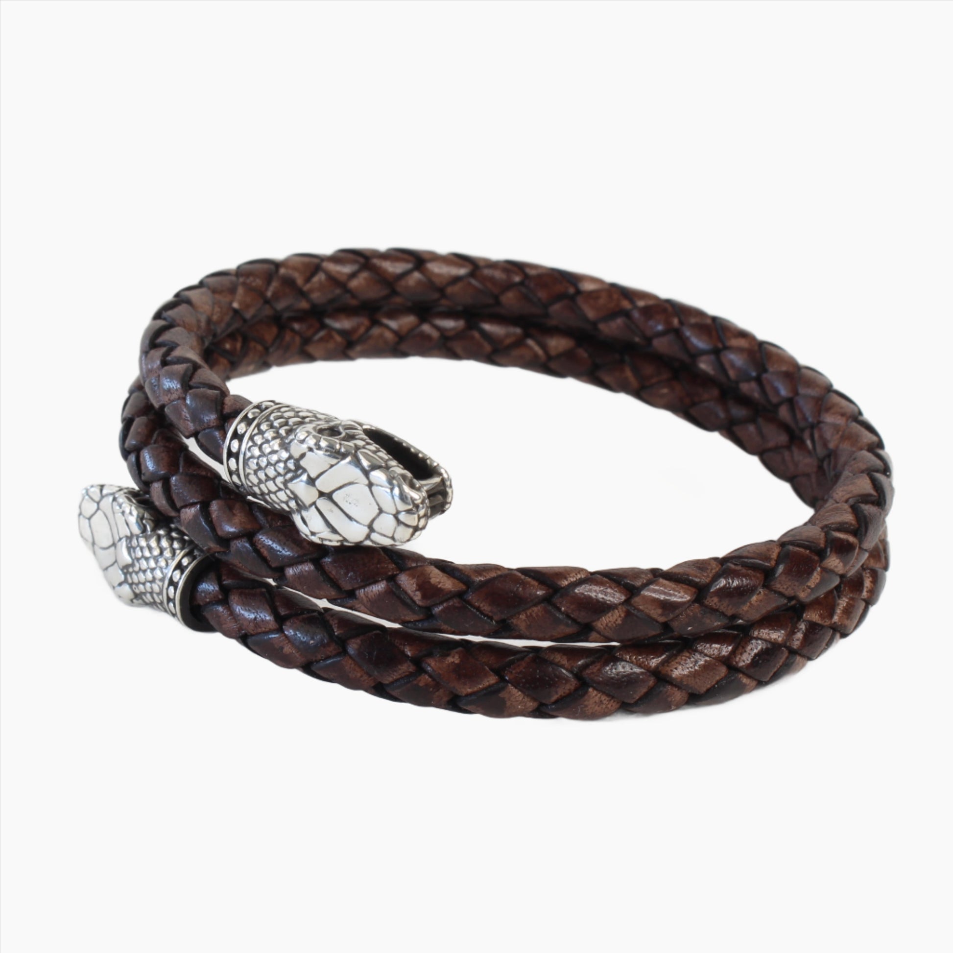 Strike a balance between bold style and timeless symbolism with this handcrafted braided leather bracelet, finished with twin snake head end caps in antique silver. The tightly woven dark brown leather pairs seamlessly with the detailed serpent motifs—each scale and curve sculpted to evoke ancient wisdom and quiet strength.