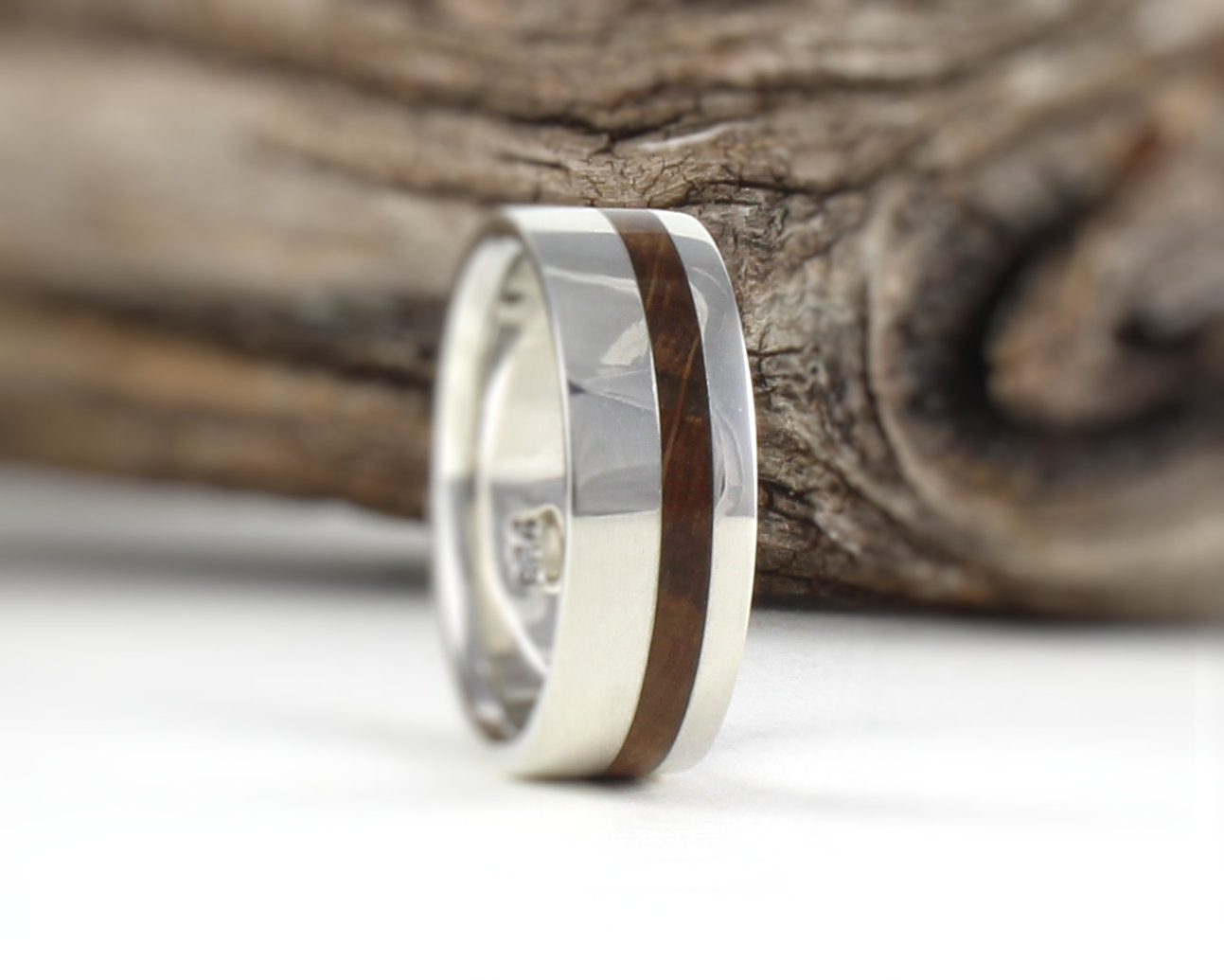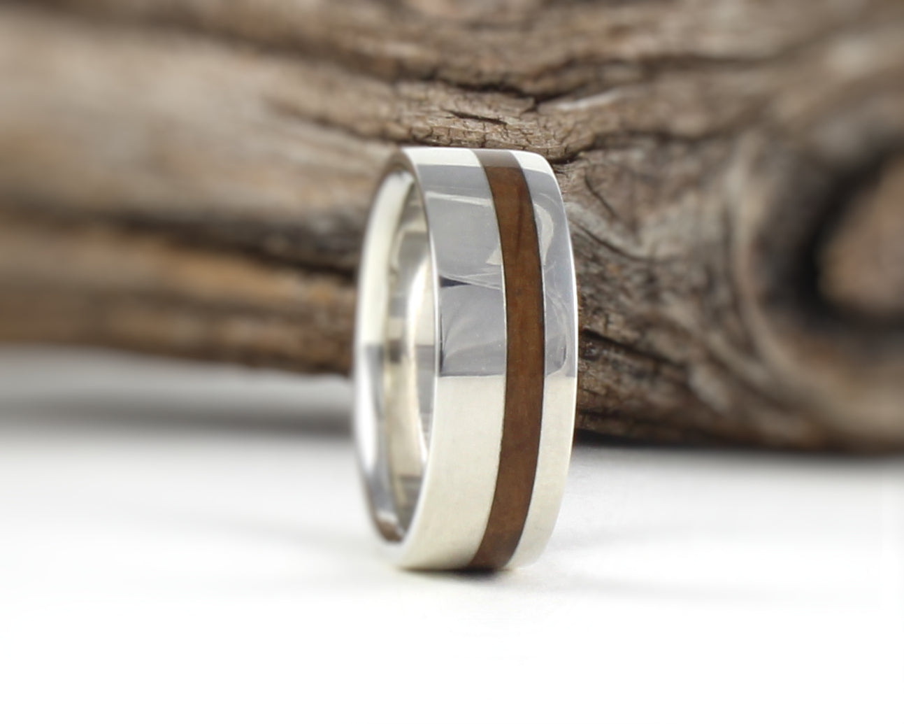 This stunning Sterling Silver Ring is sure to make a statement. Crafted with quality Sterling Silver and unique Whiskey Barrel wood, this ring will be a timeless piece for any man's jewelry collection. The carefully crafted design will give the wearer a classic yet modern look.