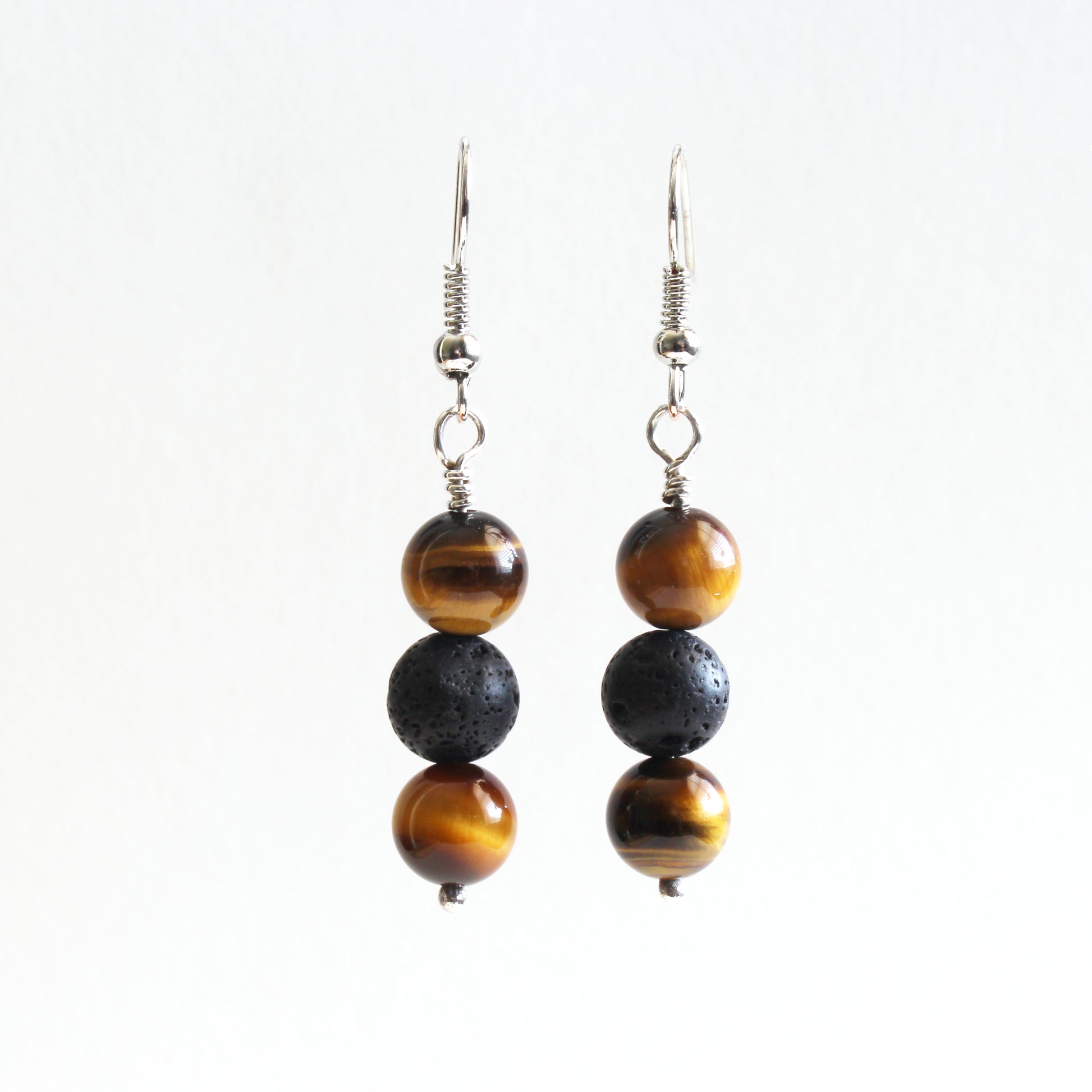 Treat yourself with these beautiful sterling silver earrings! They feature a unique combination of tiger eye and lava rock that will add a touch of glamour to any outfit. Enjoy the elegance and style of these natural stones!
