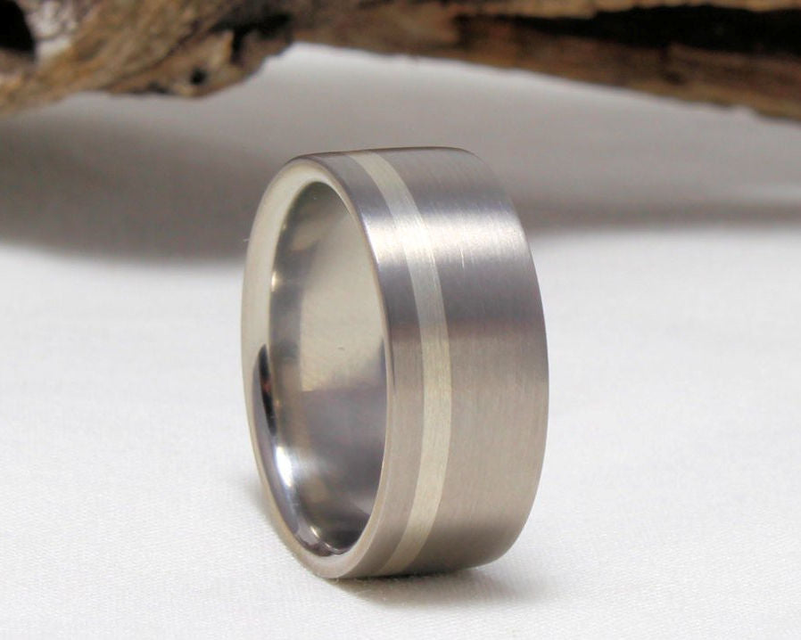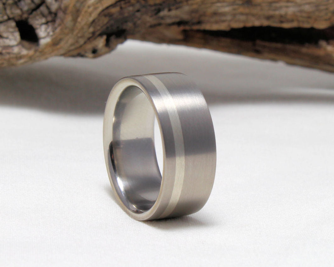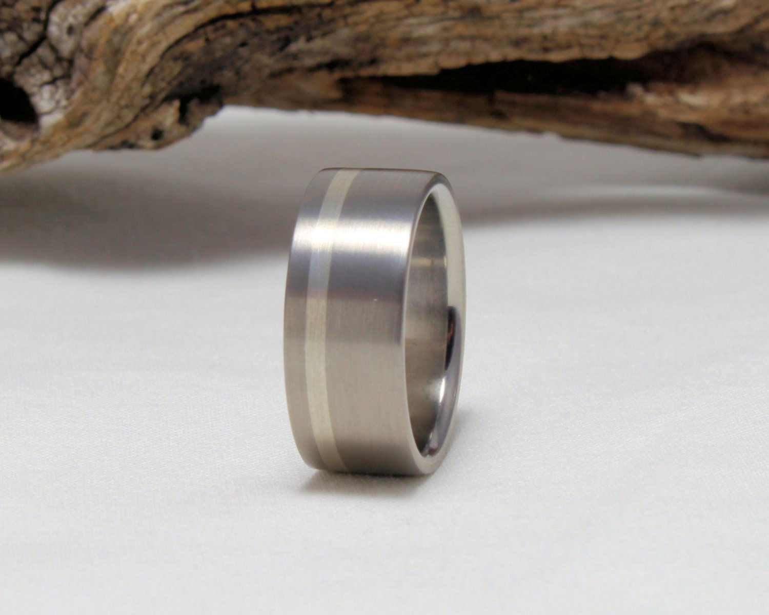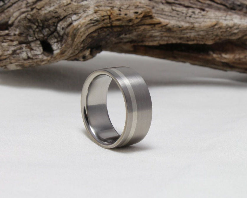 Titanium Wedding Band With Sterling Silver Inlay with Brushed Finish. 1mm SOLID STERLING SILVER Inlay that encircles the ring.