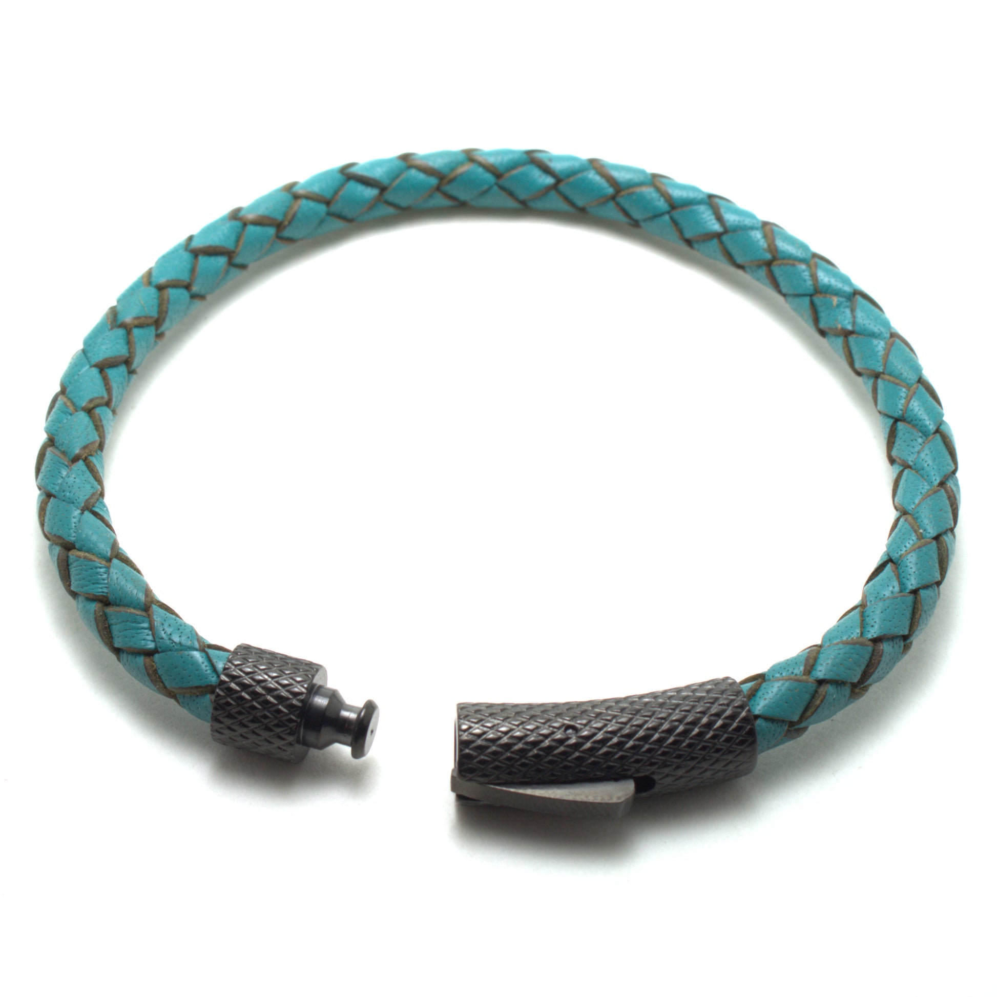 This simple braided bracelet features genuine turquoise bolo leather and a stainless-steel push or bayonet-style clasp for easy wear and a strong grip. It comes packaged in a gift box.
