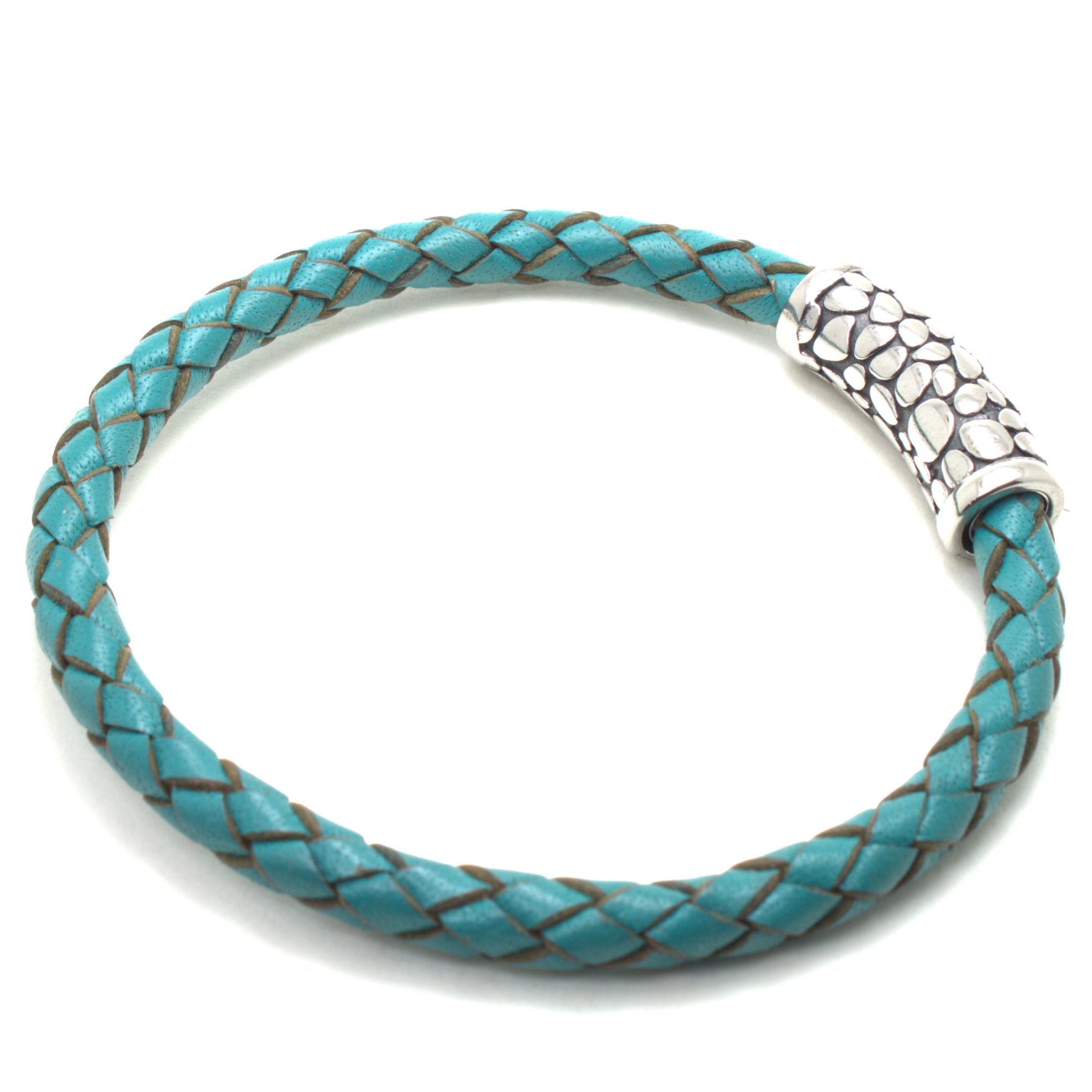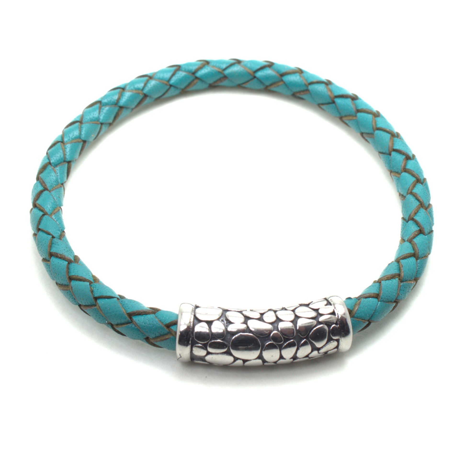 Elevate your everyday style with this handcrafted turquoise braided leather bracelet, designed for those who love natural textures with a modern edge. The vibrant turquoise leather is tightly woven for durability and comfort, while the metallic clasp features a unique pebble-textured design that adds an artisanal touch.