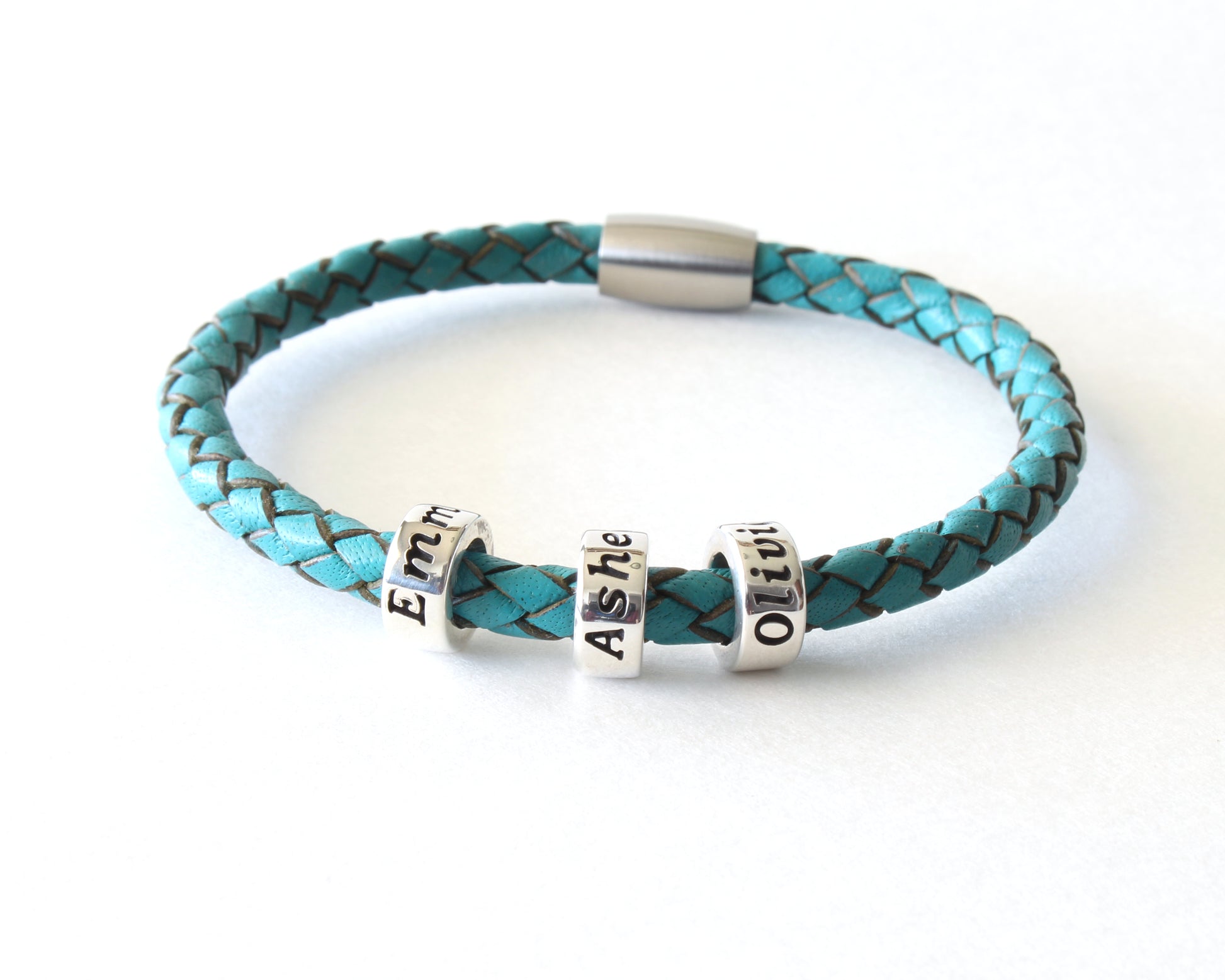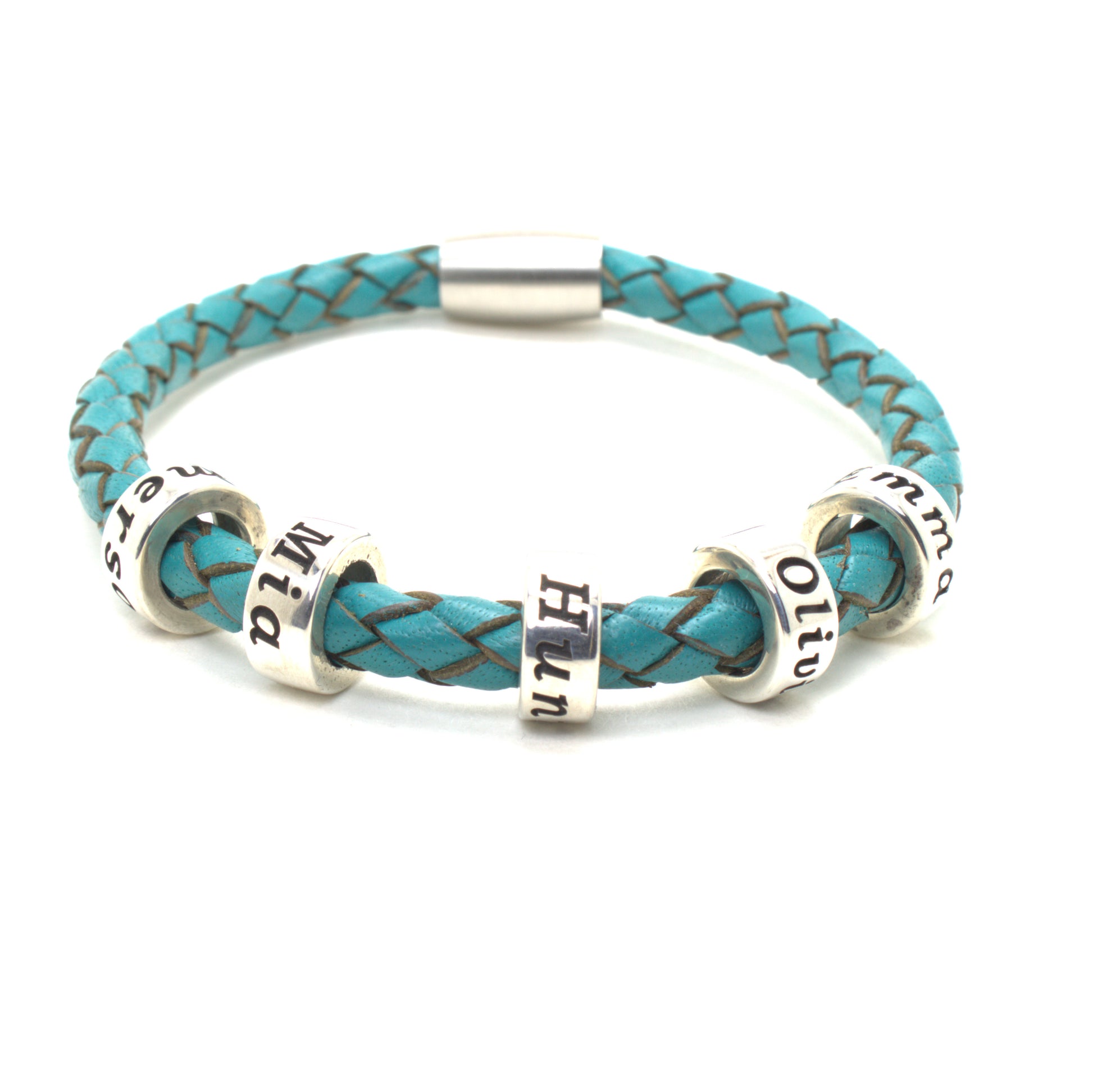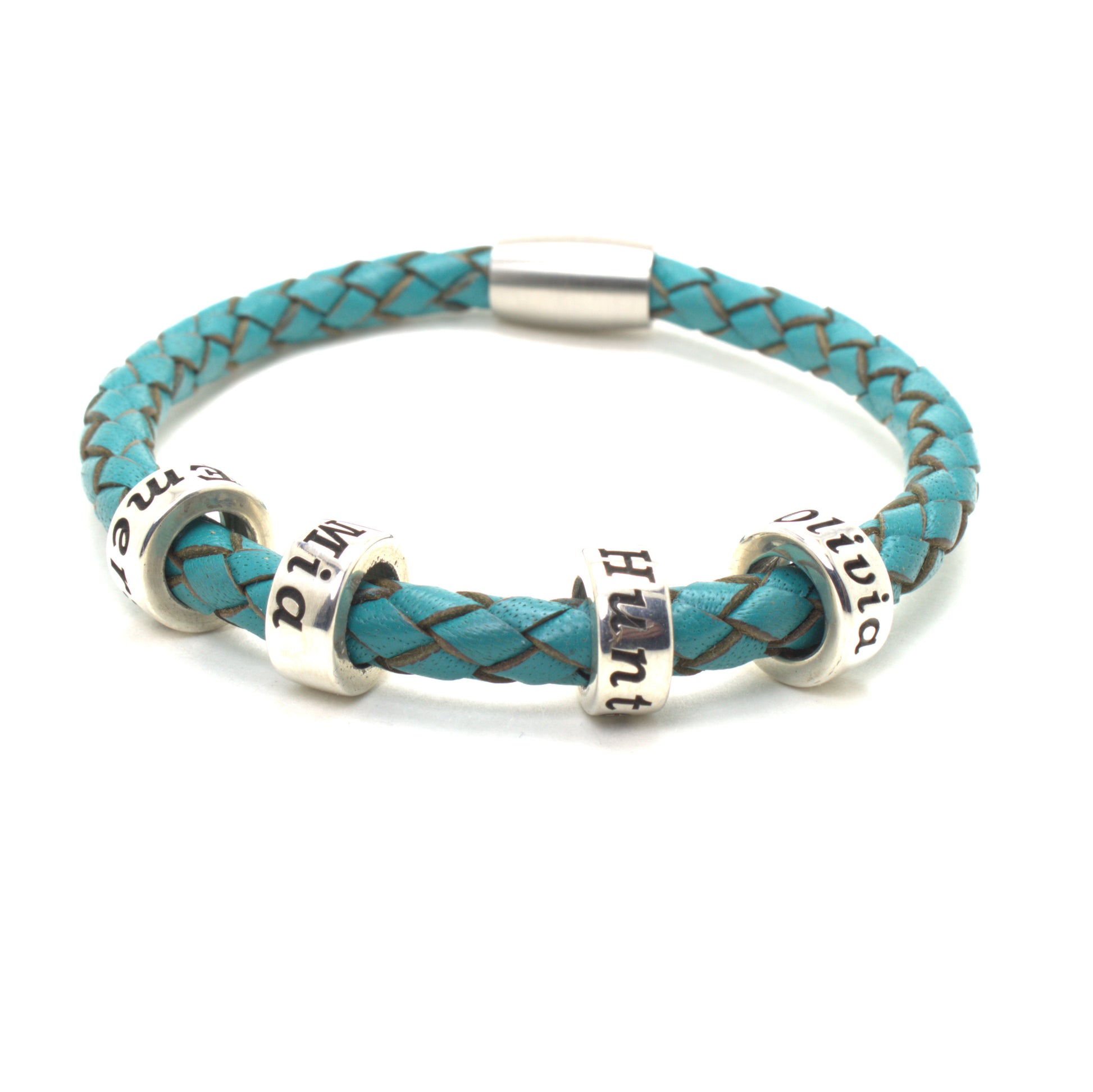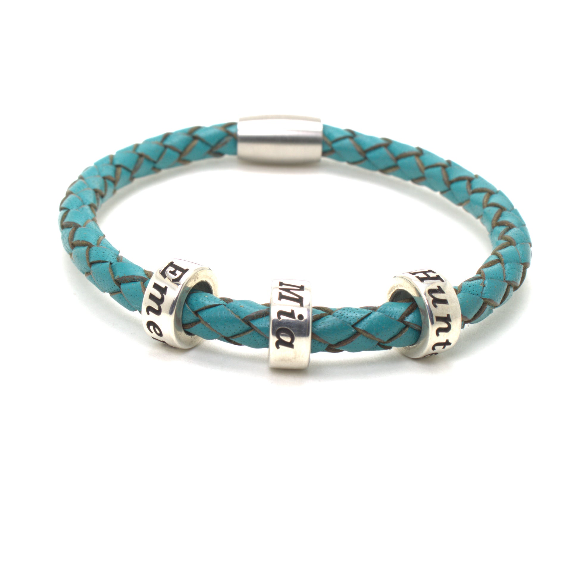 This handcrafted turquoise braided leather bracelet features sleek sterling silver beads, each custom-engraved with the names of your loved ones. The rich, turquoise leather band adds a rugged yet refined touch, while the polished silver beads stand out beautifully — making it the perfect everyday accessory for both men and women.